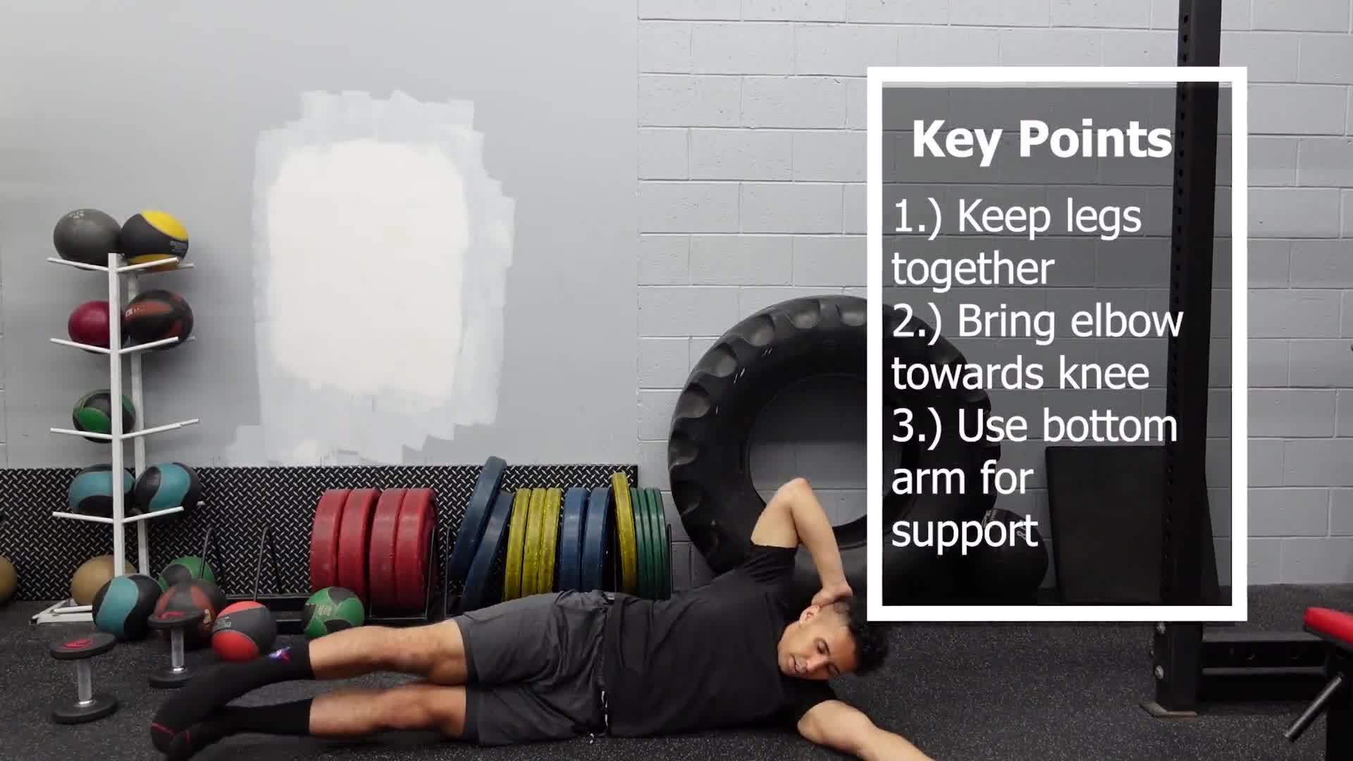 The Side lying oblique crunch is great for your obliques. The top leg lifting while bending the spine to the side allows for the lateral (side) tissues to be worked.
