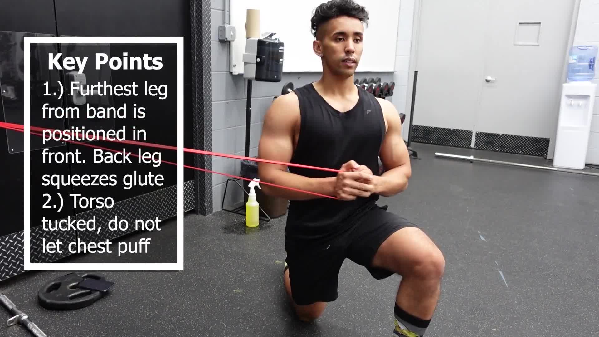 This version of the Pallof press allows you to challenge your core a little more than the kneeling version. In this lunge position, our base of support is more narrow which challenges the core more.