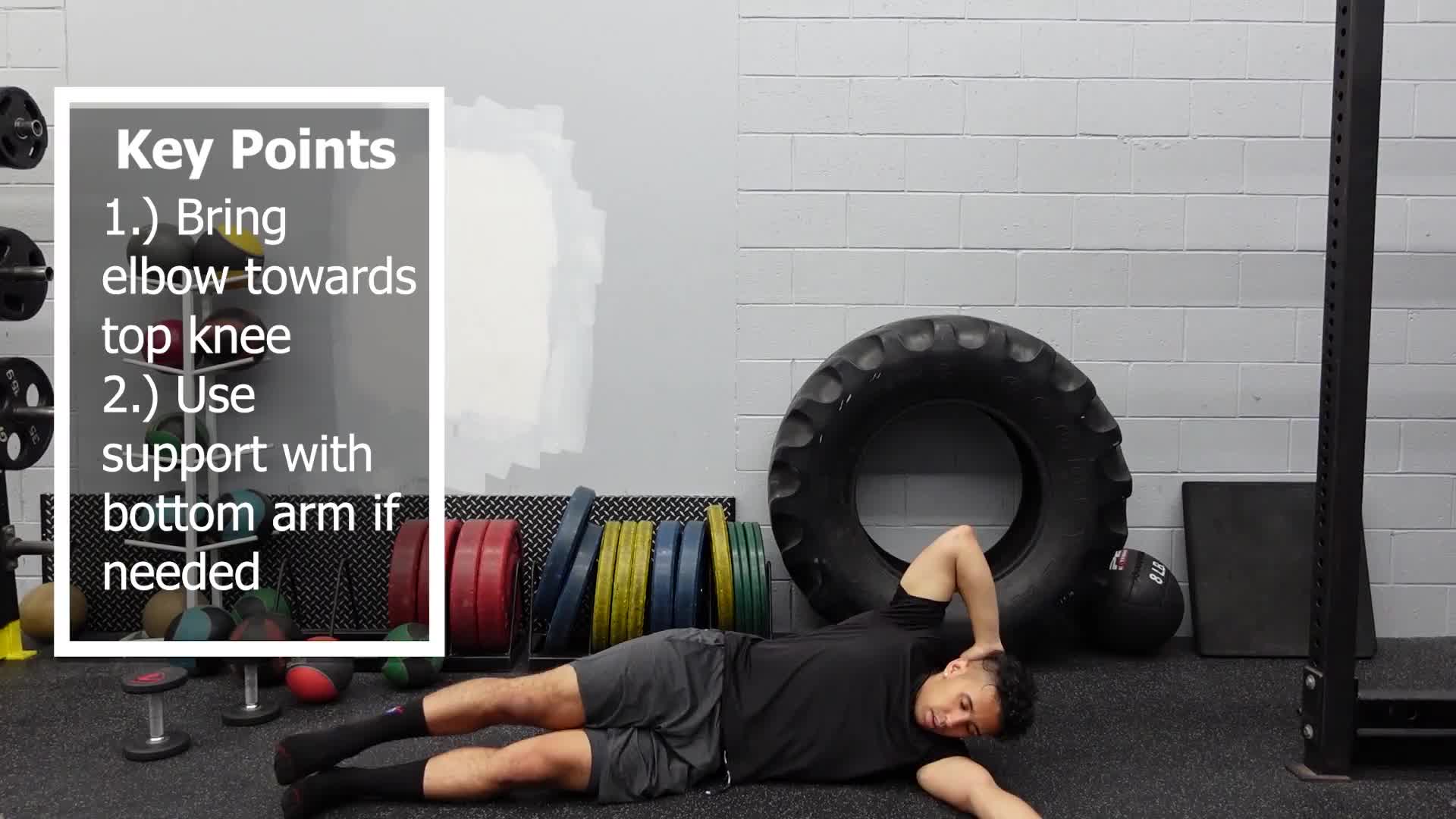 This progression of the side lying oblique crunch level 1 incorporates the bottom leg as well. This makes it more difficult by adding more weight.