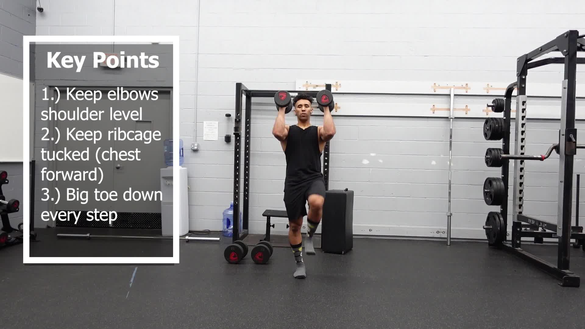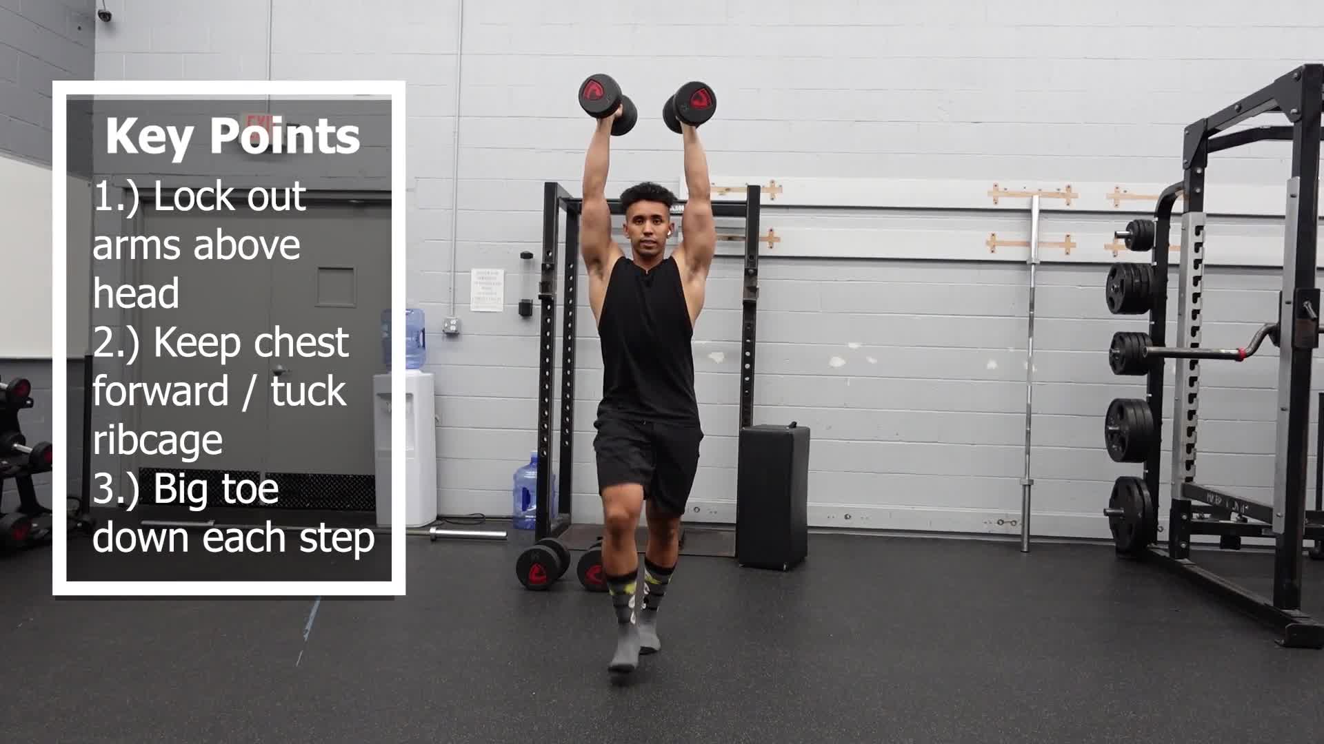 Farmers Carries are a great total body exercise. This variation involves 2 dumbbells with the hands above the head.