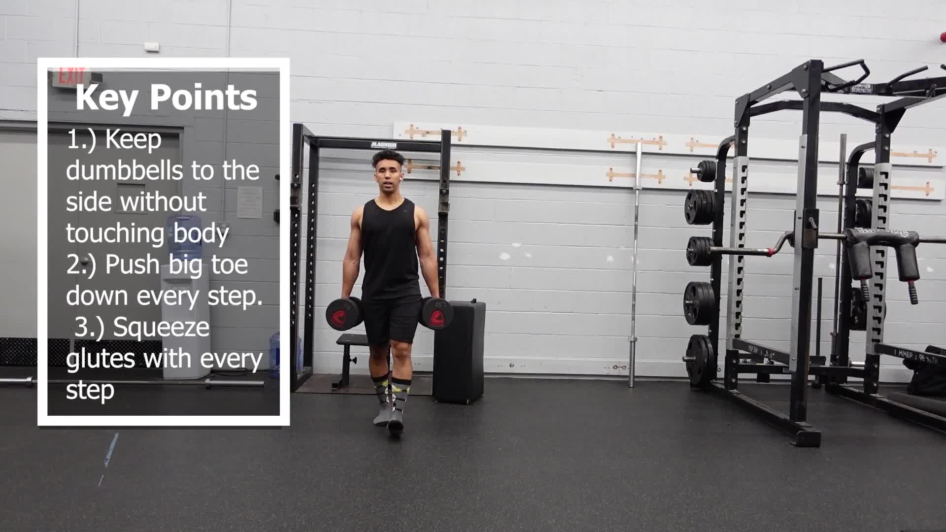 Farmers Carries are a great total body exercise. This variation involves 2 dumbbells with the hands on your side.